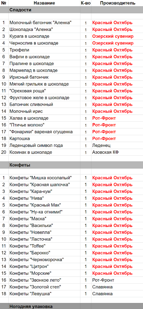 Молочный батончик "Аленка" (1 шт), Шоколадка "Аленка" (1 шт), Трюфели (1 шт), Вафли в шоколаде (1 шт), Пралине в шоколаде (1 шт), Мармелад в шоколаде (1 шт), Ирисный батончик (1 шт), Мягкий грильяж в шоколаде (1 шт), "Ореховая роща" (1 шт), Фруктовое желе в шоколаде (1 шт), Батончик сливочный (1 шт), Молочный ирис (1 шт), Конфеты "Мишка косолапый" (1 шт), Конфеты "Красная шапочка" (1 шт), Конфеты "Кара-кум" (1 шт), Конфеты "Нива" (1 шт), Конфеты "Красный Мак" (1 шт), Конфеты "Ну-ка отними!" (1 шт), Конфеты "Петушок" (1 шт), Конфеты "Васильки" (1 шт), Конфеты "Маска" (1 шт), Конфеты "Ласточка" (1 шт), Конфеты "Toffee" (1 шт), Конфеты "Барокко" (1 шт), Конфеты "Черноморочка" (1 шт), Конфеты "Цитрон" (1 шт), Конфеты "Морские" (1 шт)